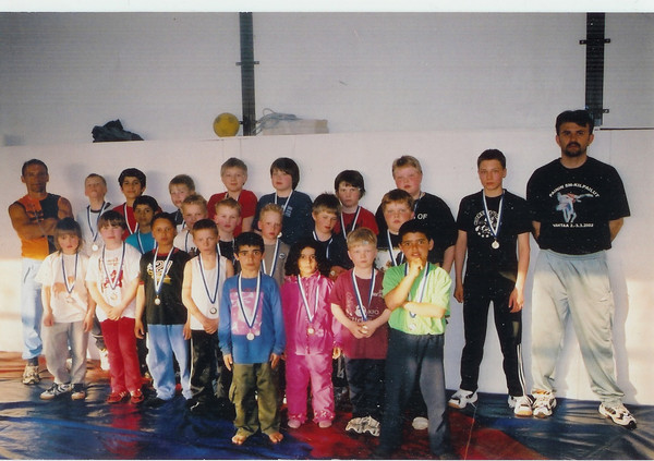 Löytyisikö tästä joukosta vääntäjiä, jotka menestyisivät omalla kotimolskilla painittavissa SM-kisoissa. Kuva keväältä 2004.