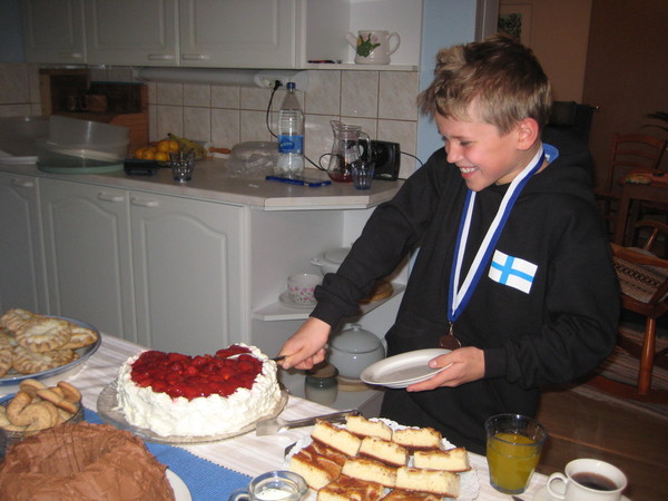 Konstan synttärikakku sai olla myös Santerin mitalikakku. Santeri voitti Peräseinäjoen KLL-paineissa neljä ottelua ylivoimaisella pistevoitolla ja hävisi yhden samalla lailla. Tuloksena KLL-pronssia 30 kilon sarjasta. Juntta onnittelee. Santeri pysyi mitalikannassa Keväällä kreikkalais-roomalaisessa painissa KLL-hopeaa ottanut Santeri pysyi mitalikannassa myös vapaapainissa, vaikka kesän aikana pari kiloa oli painoa karttunut. 30 kg: 13v 30 kg: Eemeli Moilanen Ilmajoki - Santeri Kvist Kajaani 0:4 0-7 Jere Jokinen Janakkala - Santeri Kvist Kajaani 0:4 0-6 1/2 final Juho Ronkainen Vantaa - Santeri Kvist Kajaani 4:1 7-1 Teemu Laurila, Kouvola - Santeri Kvist Kajaani 1:4 2-9 Hyvät matsit Santerilta. Paljon oli muuttunut sitten Ilmajoen painien, jossa homma meni ihan munilleen. Nyt haettiin pinnoja aktiivisesti ja parissa viimeisessä matsissa niitä tehtiin jopa jaloistakin. Pronssimatsin voitto varmistui reisinostolla. Semifinaalia Santeri johti 1-0, kunnes Ronkainen pääsi taakse. Sitten tuli kisojen ainoa huono hetki, kun Nukku-Matti valtasi mielen ja liike unohtui. Kaveri rullasi kolmasti ja peli selvä. Tuosta yhdestä tappiosta huolimatta erittäin hyvät kisat. Ja taisipa olla ihan maksimisijoituskin. 45 kg Konsta Kvist Kajaani - Jimi Haapaniemi Vaasa 0:4 0-6 Leevi Lauttanen Janakkala - Konsta Kvist Kajaani 4:0 7-0 Jo etukäteen oli Konstan kohdalla tiedossa, että sarja on kova. Sarjan kakkonen Jimi Haapaniemi näytti, jotta häränkäännön voi heittää myös pystystä. Tosi tehokas ja raaka liike, mutta Konsta punnersi sillan kautta pois. Siitä plussa. Rohkeutta painiin ja voimaa käsiin. Naiset 56 kg Julia Haapoja Lapua - Heli Moliis Kajaani 4:0sv 4-0 |