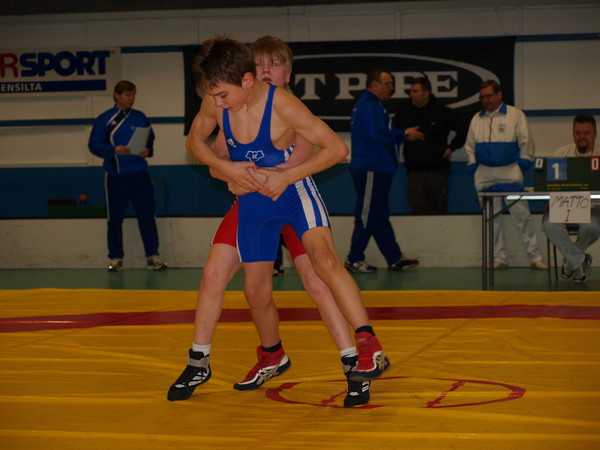 Pojat 13 vuotta 32 kg: 1) Santeri Kvist KaJu Kajaanin Juntta, 2) Timi Eronen PopI Popinniemen Isku, 3) Niklas Moilanen KI Kemin Into, 4) Petri Väkevä LrTU Lappeenrannan Työväen Urheilijat, 5) Viljami Liimatainen TuTo Turun Toverit. Santerille kisat tarjosivat yhden tutun ja kolme outoa vastustajaa. Kaikki vastustajat kuitenkin menivät selälleen heti ensi jaksolla. Pari kaveria sai jatkettua Santerin liikkeitä, mutta kaikkiaan hyvää painia. Hieman monipuolisempi vain pitäisi olla. Sitä lonkkaa kaipaillaan ja käsivarsia molemmista käsistä. Mutta hyvin painittu. Juntta onnittelee. 42 kg: 1) Ville Tuomi ViiPy Viialan Pyry, 2) Ilja Vanhala PopI Popinniemen Isku, 3) Valtteri Loppi IK Ilmajoen Kisailijat, 4) Tomi Rusanen KaJu Kajaanin Juntta, 5) Jarmo Leskelä LaLu Lapin Lukko, 6) Leo Saukko HaHe Haukiputaan Heitto. Tomi voitti ne matsit, jotka pitikin eli Lapin Lukon Aapo Kiviniemen ja Haukiputaan Leo Saukon. Sarjan voittanut Ville ja kolmonen Valtteri olivat pari vuotta vanhempia ja se ikä näkyy molskilla. Etenkin matsi Aapoa vastaan oli erikoisen hyvä. Eka jakson tappion jälkeen kaveri meni selälleen toisella. Taas talven parhaat matsit, kehitystä kehittyy. 46 kg: 1) Antti Väli-Torala IK Ilmajoen Kisailijat, 2) Konsta Kvist KaJu Kajaanin Juntta, 3) Juho Pahikainen HaHe Haukiputaan Heitto, 4) Samuel Purola OP Oulun Pyrintö, 5) Atte Vuoristo HaHe Haukiputaan Heitto. Konsta paini myös talven parhaat kisansa. Hienot taisteluvoitot Juhosta, Samuelista ja Atesta osuivat lauantaille. Nyt ei luovutettu tappioasemassakaan, vaan taisteltiin loppuu saakka. Uusi harjoituksissa opeteltu ylöstulokikka onnistui sataprosenttisesti ja varmisti kakkossijan. Sunnuntain finaalissakin Antti meni kerran lenkkiin, mutta heitto vain meni ulos matolta. Hyvää taistelua ja ainoastaan yksi pieni herpaannus siinä viimeisessä tilanteessa. Käsi pois kainalosta ja syliheitto takaisin.. Tytöt 18 vuotta 57 kg: 1) Heli Moliis KaJu Kajaanin Juntta. Naiset 63 kg: 1) Janika Lönnqvist HaHe Haukiputaan Heitto, 2) Hanna Ullakko KI Kemin Into, 3) Heli Moliis KaJu Kajaanin Juntta. Helillä pukkasi lauantaina jo kuumetta ja se näkyi matolla. Samoin näkyi sarjaa isommat vastustajat. |