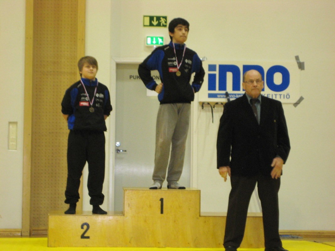 Johan - Purola (3-3, SV) Johan pääsi ottamaan Juntan pojista eniten matseja ja se teki hyvää. Huomattavasti enemmän kisoja talven aikana kiertänyt Pyrinnön poika oli hyvä vastustaja. Johan paini poikkeuksellisen rauhallisesti ja malttoi kuunnella huollon neuvoja. Ekassa erässä noustiin 3-1 tappioasemasta tasoihin. Purola taisteli erän lopun hienosti sillassa kongin kumahdukseen saakka. Toisessa erässä Johan pamautti niskalenkin. Enää eivät Samuelin voimat ja happi riittäneet välttymään selätykseltä.